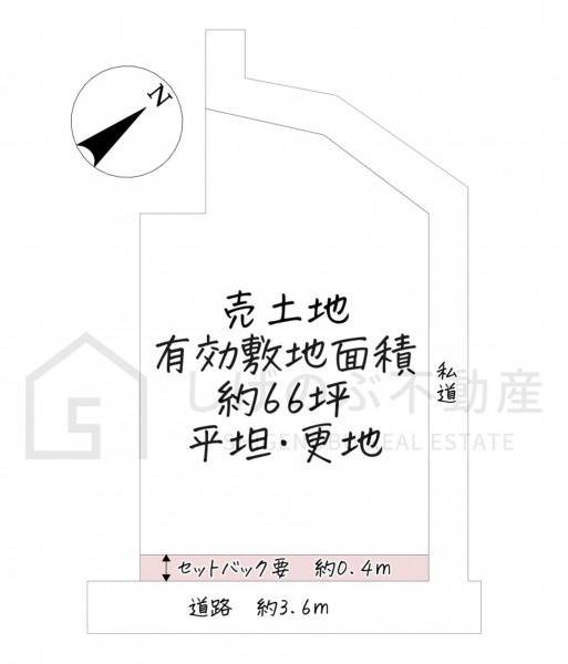 | 接道状況 | 南東側 公道12.1m 間口約3.6m 北側 私道 |
