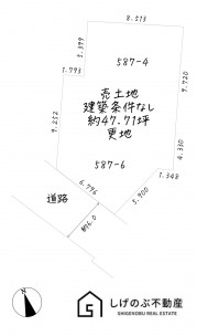 ・都市ガス(宅内引込必要)⇒ 買主負担 ・公営水道(宅内引込必要)⇒ 買主負担 ・①587番4:公簿:94.97㎡、仮測量:94.96㎡ ②587番6:公簿:62.75㎡、仮測量:62.79㎡ ※敷地合計地積:(公簿)157.72㎡(47.71坪) :(実測)157.75㎡(47.71坪) |